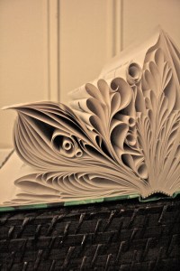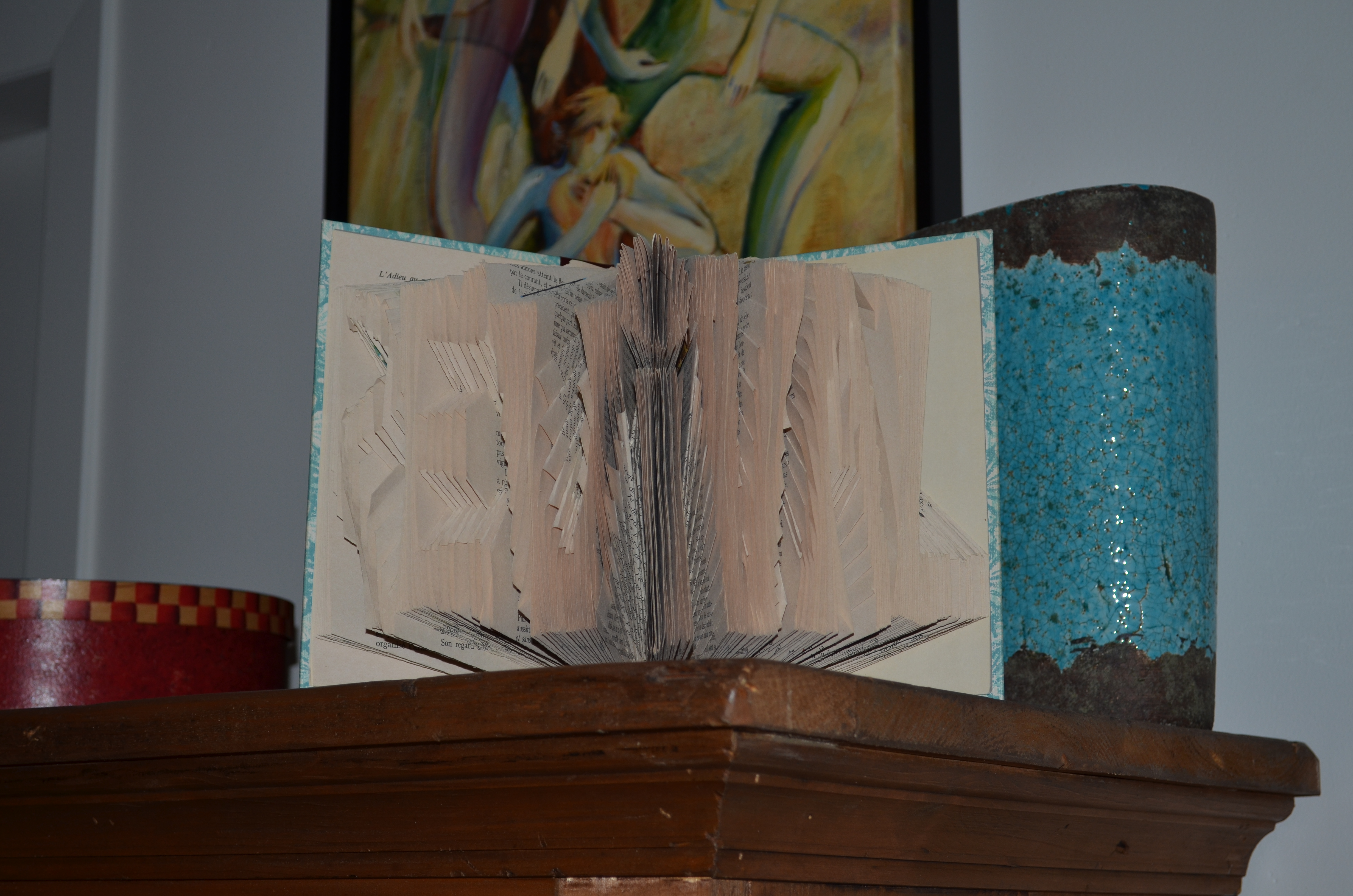 À son tour, Gabrielle m’a partagé ce qu’elle avait commencé à faire comme petite « entreprise » à temps partiel, si on peut dire ainsi. Elle fabrique, à partir de vieux livre, de l’art visuel qu’elle vend. C’est absolument extraordinaire. Je m’explique, elle écrit un mot avec les feuilles du livre, dans le livre. C’est de toute beauté!!! En plus moi qui aime les livres. Cela doit lui prendre beaucoup de temps et aussi de la patience. Je n’ai vu cela nulle part ailleurs. C’est vraiment personnalisé puisqu’on peut choisir le mot qu’on veut, selon sa personnalité ou ses goûts. C’est vraiment original et beau, c’est charmant.