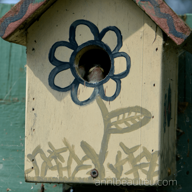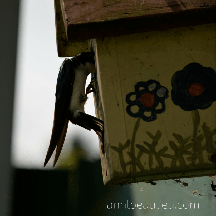 Un matin, alors que j’étais assise dehors dans ma balançoire prenant mon temps d’intimité avec mon Dieu, j’ai levé les yeux et j’aperçus l’hirondelle dans sa petite cabane d’oiseaux. À ce moment-là, il m’est tout de suite monté à l’esprit le verset dans Matthieu 6 : 26.