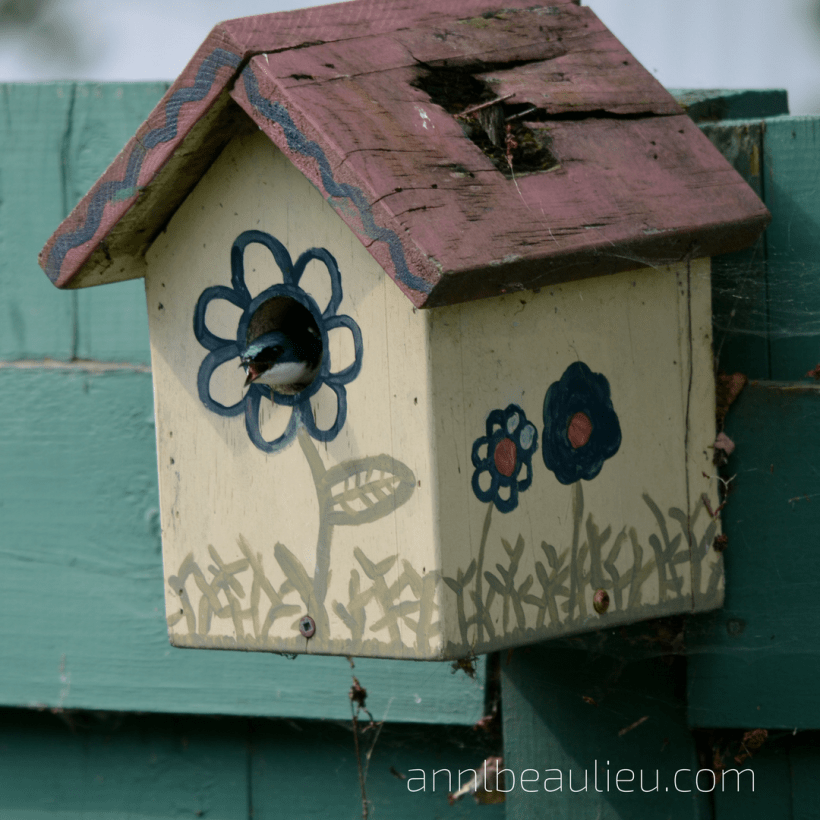 P.S. : Si vous trouvez que la cabane d’oiseaux est vieille, c’est parce que c’est la cabane que mon fils a faite, elle a plus de 18 ans! Je garde mes vieilles reliques, des souvenirs précieux… hé hé